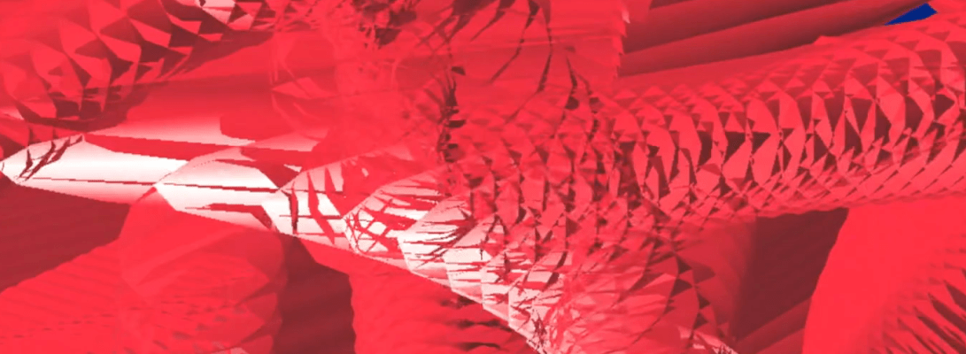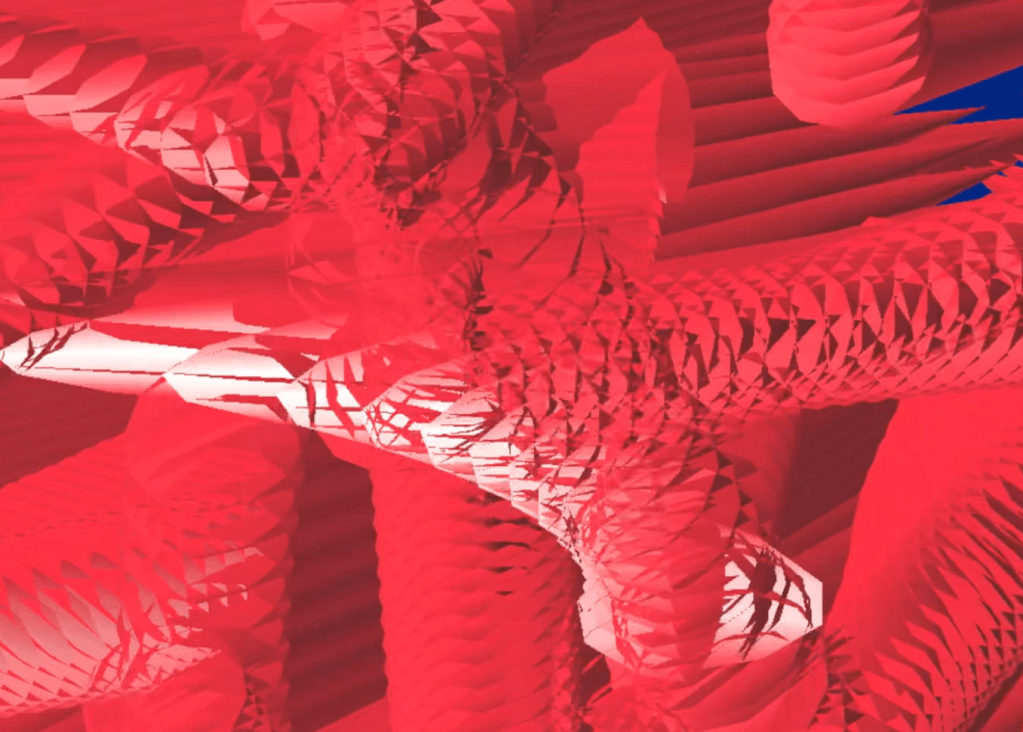 The forms in my work are made by trails or paths through space that are represented by shapes arranged along the routes. These markers can be considered as being a bit like the cells in wood. The algorithm that determines how to display the forms is made to ‘clip’ anything that gets within a certain distance of the viewpoint of the ‘virtual camera’. So, when the graphic display of the work is calculated it effectively slices through the forms, revealing the inside of the shapes and this creates the patterns that can be seen. It is as if the shapes have been sawn through at a certain distance from the viewer. As this view is continually recalculated as the program runs, as the viewpoint or the object move, or the distance at which the clipping is to take place is changed, the patterns also change.