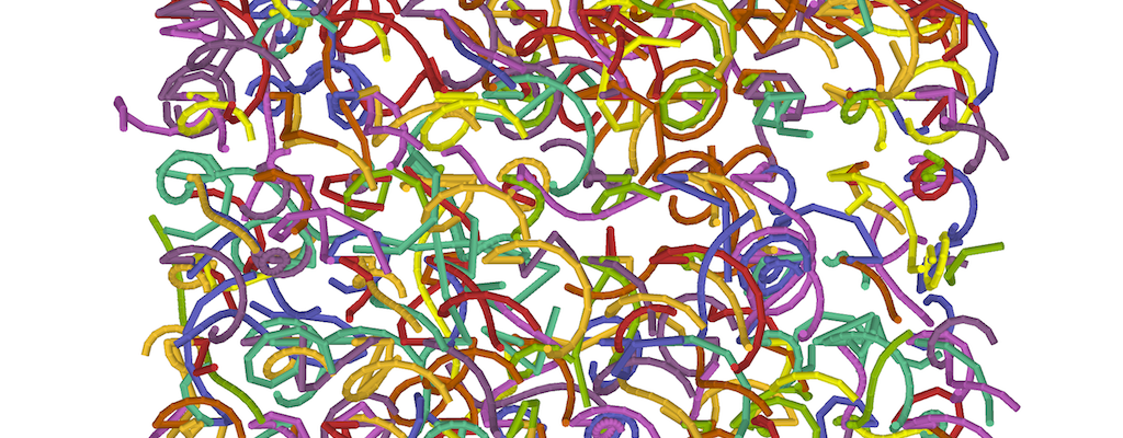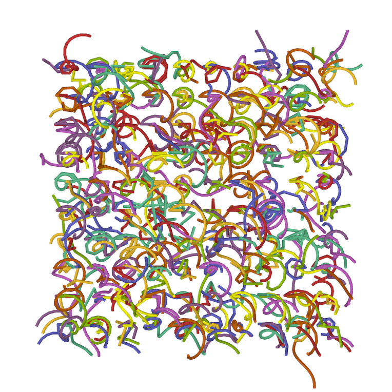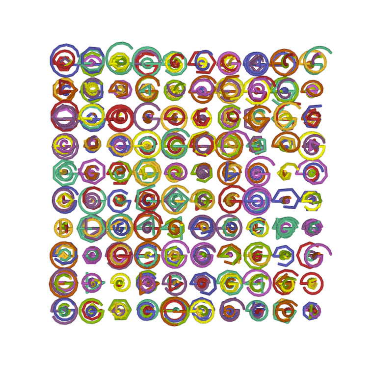 Two videos were made for the four-screen video wall at BCS Moorgate. A matrix of rotating helices of random length, frequency and amplitude provide constantly changing apparent conjunctions and combinations of shape as their overlapping forms coincide. The phases of the piece – where coloured shapes are replaced temporarily by monochrome ones and then replaced in turn by more brightly coloured helices is roughly based upon the menstrual cycle. Each video was generated using a different random number seed for the pseudo-random number generator, leading to different instances of the potential compositions.