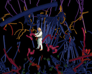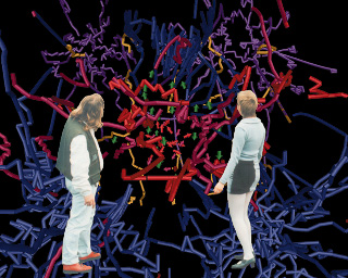 Another important aspect of the work I did not mention would be that by experiment and investigation of the environment it would be found that organic shapes and forms were not organic, that behaviours were driven by very simple rules, in the final analysis that much of the ‘sense of place’ would be constructed through the imagination of the participant as they try to make sense of the VRAPI.” ( 20th November 2003)